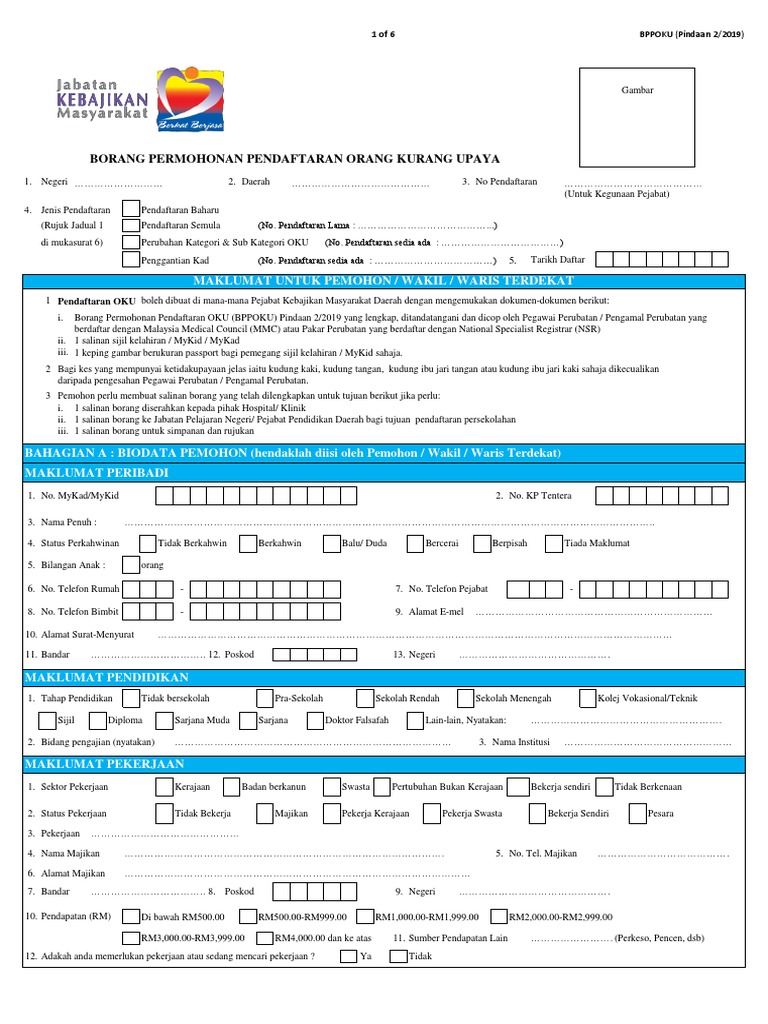 Related : Borang Permohonan Pendaftaran Orang Kurang Upaya : Borang permohonan pendaftaran orang kurang upaya pindaan 2019 (bppoku pindaan 2019) yang lengkap ditandatangani dan dicop oleh pegawai perubatan/ pengamal perubatan yang berdaftar dengan malaysian medical council (mmc) sahaja atau pakar perubatan yang berdaftar dengan..