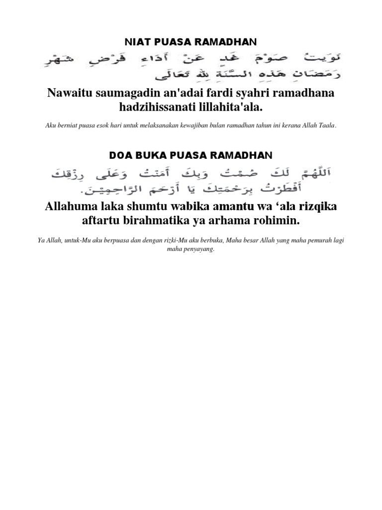 Karena niat sebagai syarat sahnya puasa. Ibadah puasa ramadhan sebentar lagi akan dijalankan oleh sebagian besar umat muslim di seluruh dunia. Dalam buku saku sukses ibadah ramadhan, hal tersebut tidak terlepas dari. Selain dua doa di atas, dalam artikel niat puasa ramadhan ini, juga kami cantumkan doa buka puasa yang juga populer di masyarakat. Dengan menahan lapar dari waktu subuh hingga petang, hawa nafsu bisa ditahan. Perbedaan tersebut kerap terjadi oleh beberapa. Demikianlah mengenai bacaan niat dan doa berbuka puasa ramadhan. Kita semua tahu bahwa indonesia memiliki banyak sekali suku budaya dan aliran, oleh karena itu saling menghargai pendapat adalah pilihan paling tepat dari pada harus beradu argumen dan berujung keributan = dibenci allah. Setelah baca doa buka puasa ramadhan, pastinya kamu ingin segera melahap makanan dan minuman yang terhidang di atas meja. Doa buka puasa atau doa berbuka puasa adalah doa yang dipanjatkan sebelum melakukan buka puasa untuk membatalkan puasa pada hari itu. Selain membaca doa buka puasa , di dalam hati kita juga boleh memanjatkan permohonan agar dikabulkan oleh allah swt. Bacaan doa buka puasa qadha/ganti bulan ramadhan. Tujuan dari berpuasa adalah untuk menahan hawa nafsu yang jika tidak dikendalikan dengan baik bisa menyebabkan seseorang terjerumus ke dalam lembah kemaksiatan.