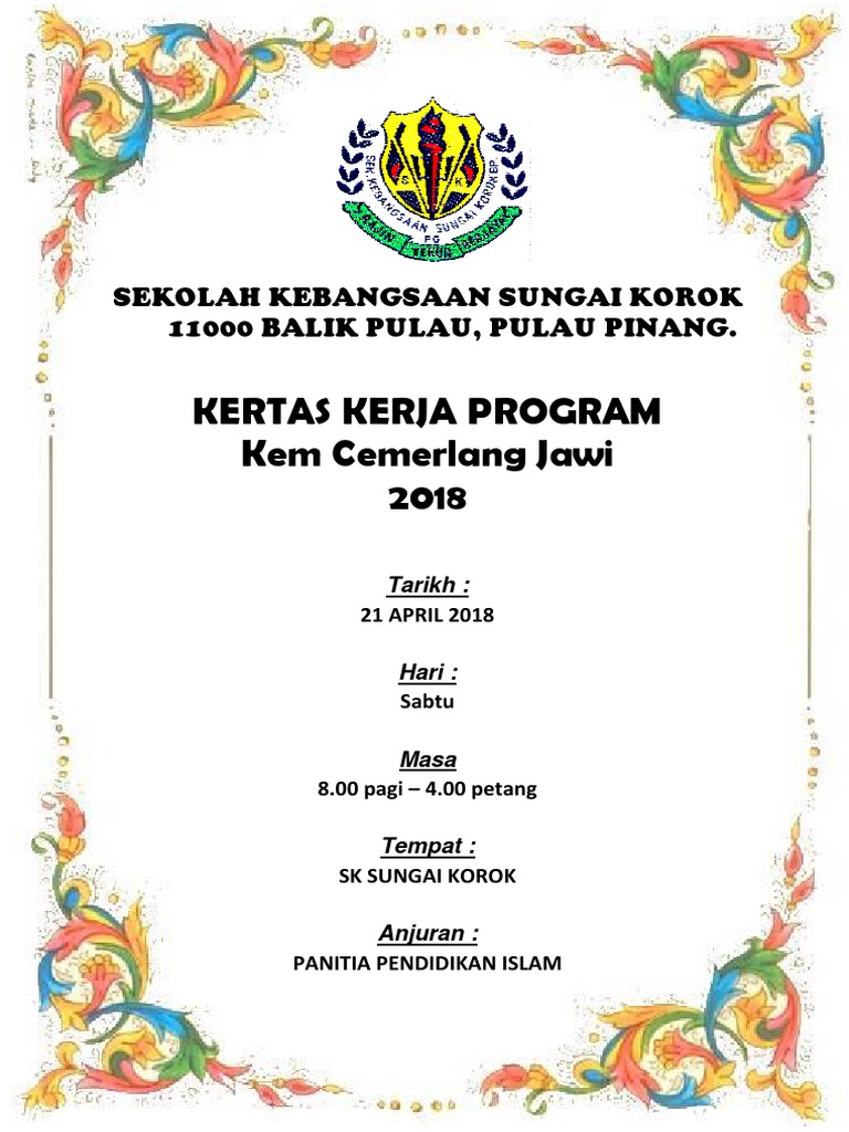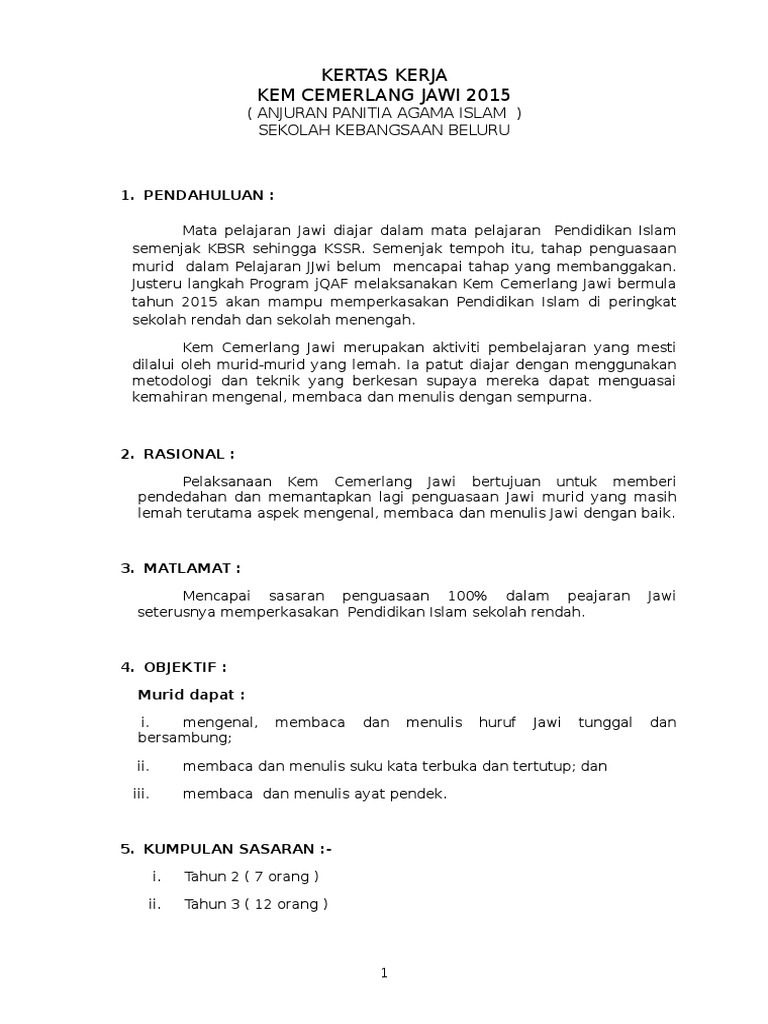 Kertas Kerja Kem Jawi Sumber Pendidikan Kulit Kcj from data03.123doks.com Soalan kem cemerlang jawi perokok p contoh kertas kerja ceramah lbe buku program majlis anugerah u spm pai 1 core mesyuarat jawatankuasa kurikulum pertama 2011. ( anjuran panitia agama islam ) sekolah kebangsaan beluru. Antara kertas kerja yang terdapat dalam koleksi ini seperti, kertas kerja kem bestari solat, kem cemerlang jawi, bulan kemerdekaan, hari keusahawanan, kertas kerja minggu bahasa dan banyak lagi. Kertas kerja ini bertujuan untuk mendapatkan kelulusan pengarah kolej matrikulasi kedah, kementerian pendidikan malaysia bagi mengadakan kem motivasi kakom semester satu 2013 / 2014. There is document kertas kerja kem cemerlang jawi pertama 2015 available here for reading and downloading. Namun demikian ada enam jenis tipe kertas audit yang biasanya dikenal, yaitu : Multimedia dalam pengajaran dan pembelajaran modul pemulihan jawi di bilik darjah. Justeru langkah program jqaf melaksanakan kem cemerlang jawi bermula tahun 2017 akan mampu memperkasakan pendidikan islam di peringkat.